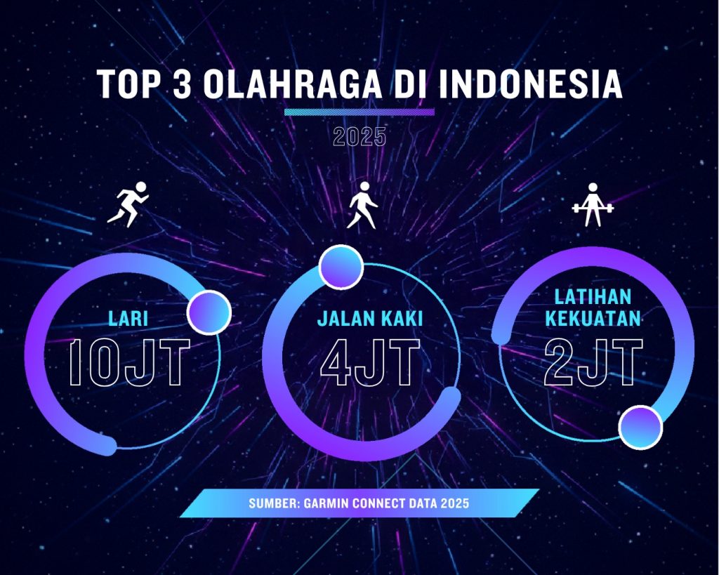 Di Indonesia, tiga olahraga terpopuler sepanjang 2025 adalah lari, jalan kaki, dan strength training. Lari mencatat lebih dari 10,6 juta aktivitas, disusul jalan kaki dengan 4,7 juta.
