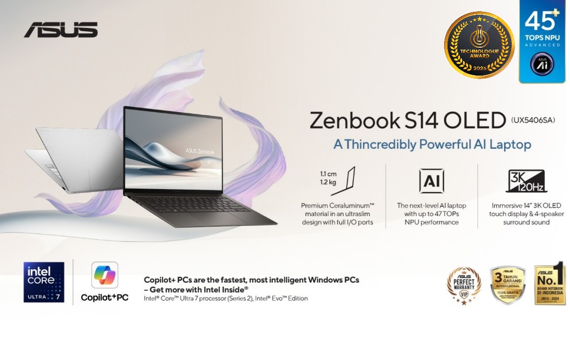 ASUS Zenbook S14 OLED UX5406SA, Laptop AI Terbaik Berbasis Intel